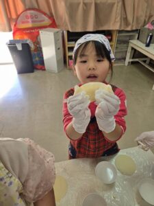 11月のクッキング保育はプランターで育てたさつまいもで「🍠スイートポテト&ぎょうざのつつみ揚げ🍠」を作りました。身支度を整え、手を洗ったらクッキングスタート!!給食室で煮てもらったさつまいも🍠まずは2種類のさつまいも🍠の味比べ!!甘くておいしかったね!!袋に入れてモミモミ!!「あついよ~あついよ~」と言いながら一生懸命つぶしていました!!みんながつぶしたさつまいも🍠をボウルに集めて、バター、砂糖を入れてコネコネ!!(さつまいも🍠がやわらかかったので生クリーム・牛乳は入れませんでした。)子どもたちに丸めてもらう予定でしたが、生地がやわらかくてスプーンでカップに入れました。最後に先生が卵黄をぬって出来上がり!!個性豊かな「ぎょうざのつつみ揚げ」もできましたよ!!給食室で焼いてもらい、おやつでいただきました!!おいしかったね😋
