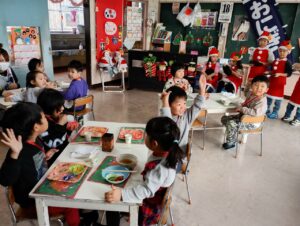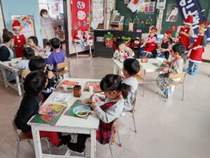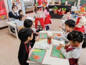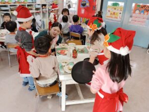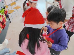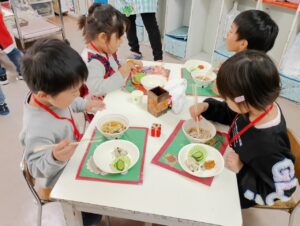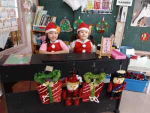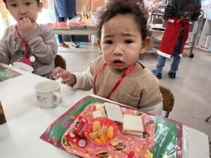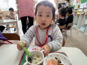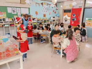 前日にはお店屋さんの飾りつけ!!毎年恒例!!みんなが楽しみにしていたおたのしみ会です!!この日はももぐみさんがウエイトレスさんになって、おにぎり🍙うどん屋さん、お子様セット屋さんのお店屋さんの開店で~す!!