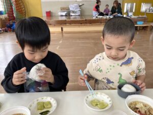 蒸しあがったもち米から、とてもいい香りがしてきましたメラメラいよいよおもちつきです。みんなのかけ声と一緒に「ぺったんこ~!!」「ぺったんこ~!!」子どもたちと保育士で頑張って、おいしいおもちをつきましたアップおもちは「きなこ」「あんこ」「ごま」から好きな味を選んでいただきました!!とってもおいしかったね!!😍来年も、おいしいおもちが食べられますように😍
